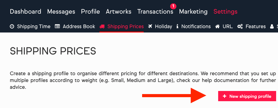 If you wish to set up a new shipping profile, go to your Seller Portal > Settings > Shipping Prices > New shipping profile