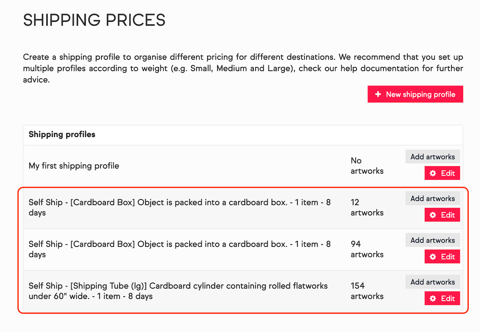 If you are an existing artist who has been opted into managed shipping, some shipping profiles will have been automatically created for you as per the below. We would however recommend that you check all artworks associated with the respective profiles to ensure that all of the information is correct.