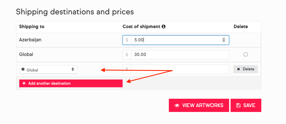 You can also remove a destination by clicking the “Delete” button on the right-hand side of the destination. Please note that it will not be possible to remove your country of residence from the shipping table!