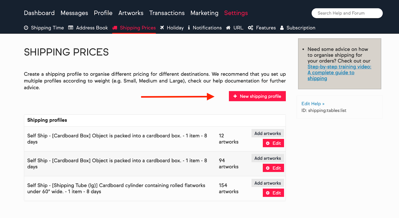 To delete a shipping profile you must first ensure that it is not linked to any artworks (this can only be achieved through the Edit artwork page.)