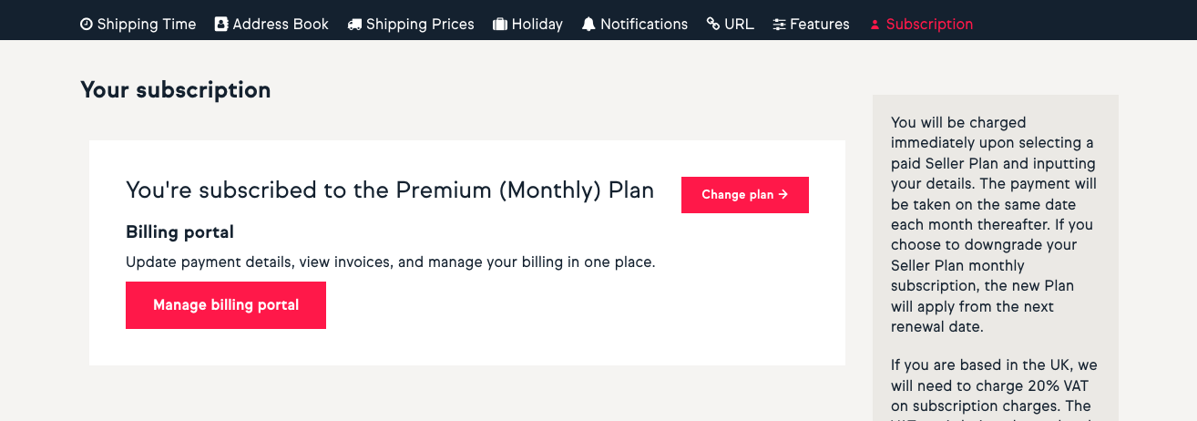 To update your Seller Plan subscription, simply head to Dashboard > Settings > Your subscription > Manage. You will then be able to select a new plan by upgrading or downgrading, depending on your current plan.
