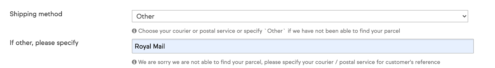 In cases where your shipment is not supported, please select ‘Other’ as a shipping method and manually add the specific carrier used. This will enable your customer to track the shipment through the specific carriers website, or through tracking pages such as 17 Track.