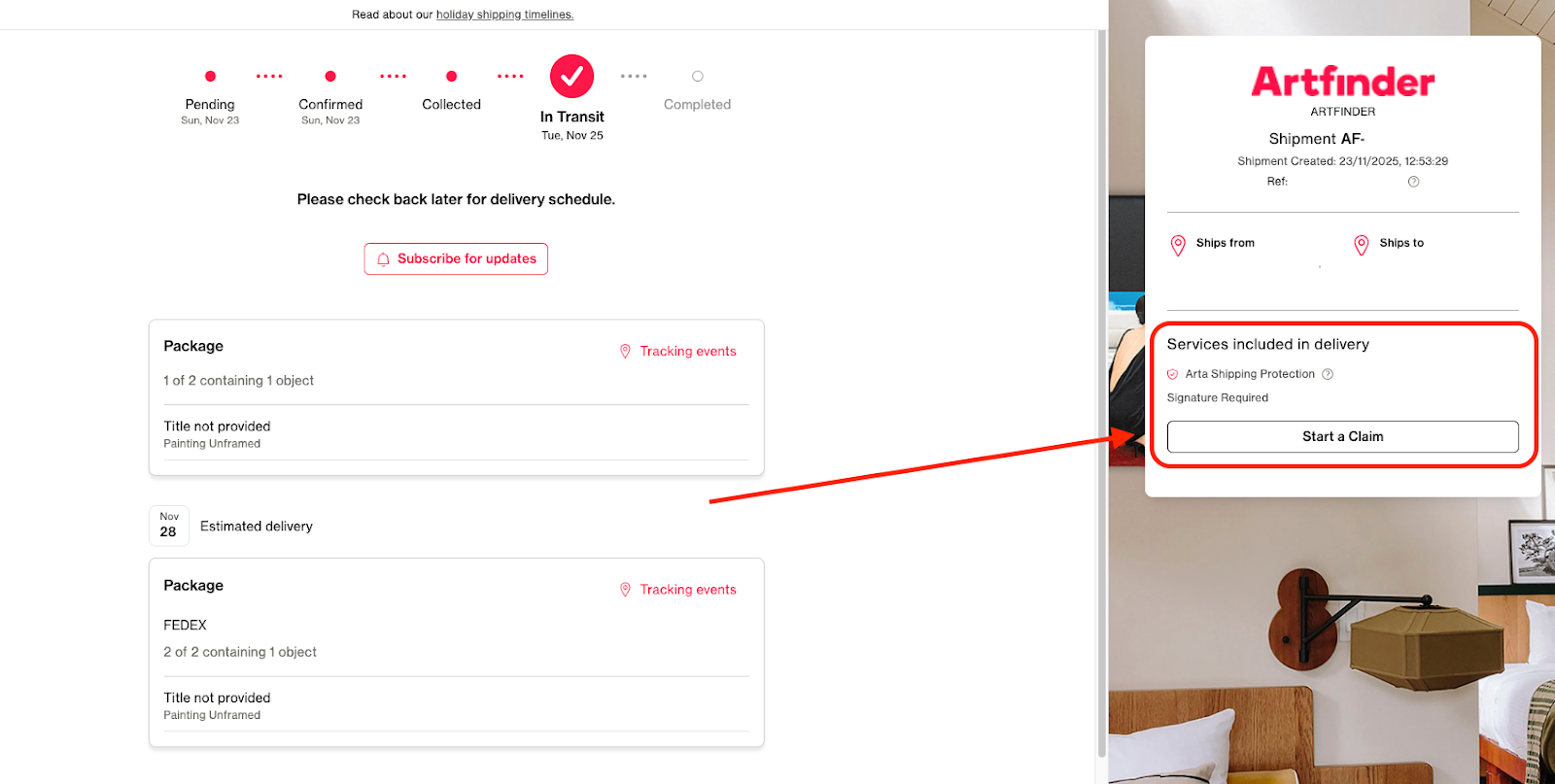 Arta provides a tracking page and sends automated notifications (via email or text) to both the artist and the buyer as the shipment hits key milestones. You will therefore be kept updated of where your artwork is at every step.
