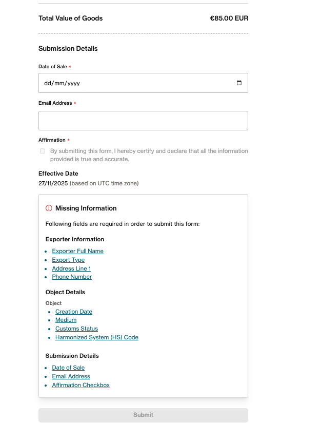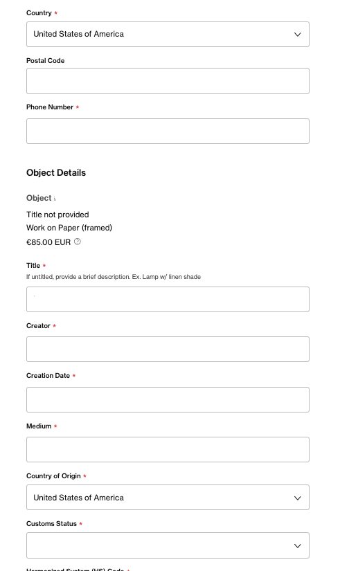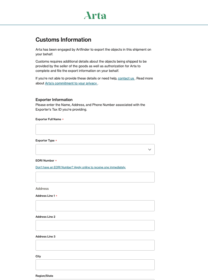 If it's an international shipment, eg. US to Europe or UK to US etc, artists will receive an electronic customs declaration form via email, which will need to be completed (this includes just regular information about artwork title, medium, your address, phone number etc) as Arta will require this information in order to manage the shipment. After this has been received by Arta, they will then be able to send through the labels for your shipment.