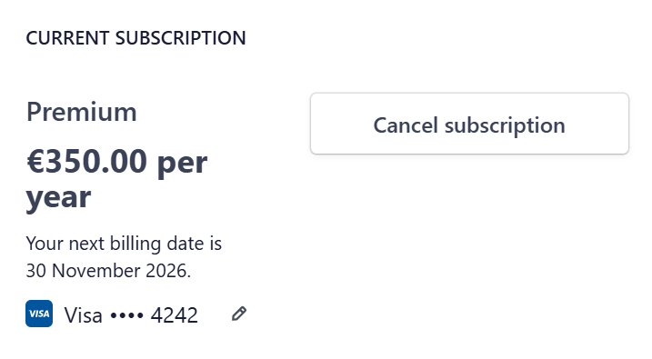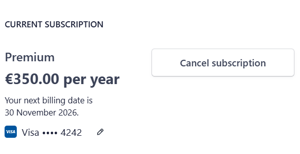 Your Current Subscription (Core or Premium), and if you pay monthly or yearly for your subscription, you can also see the card associated with these subscription payments below and your next billing date for these recurring payments.