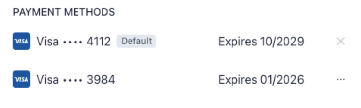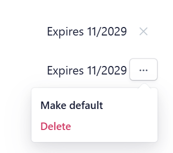 You are able to remove and add payment methods to pay for your subscriptions as and when required. You can also delete existing payment cards from your account by clicking the three dots on the far right next to the payment card.