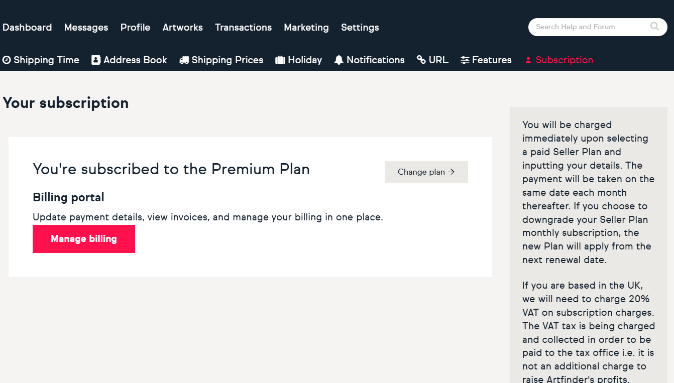 To update your Seller Plan subscription payment method, simply head to Dashboard > Settings > Your subscription > Manage. You will then be able to select ‘Manage Billing’ as seen below