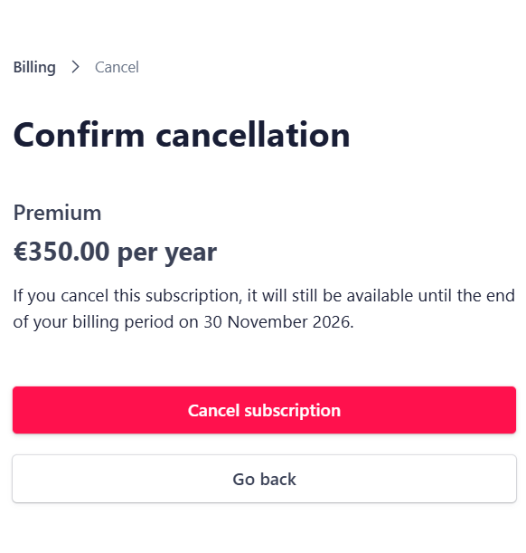 It will take you to the following window to double-check you’re clicking through to the correct window. If you do want to proceed, you will click the red button ‘Cancel Subscription’, or you can ‘Go Back’ if you do not want to proceed.