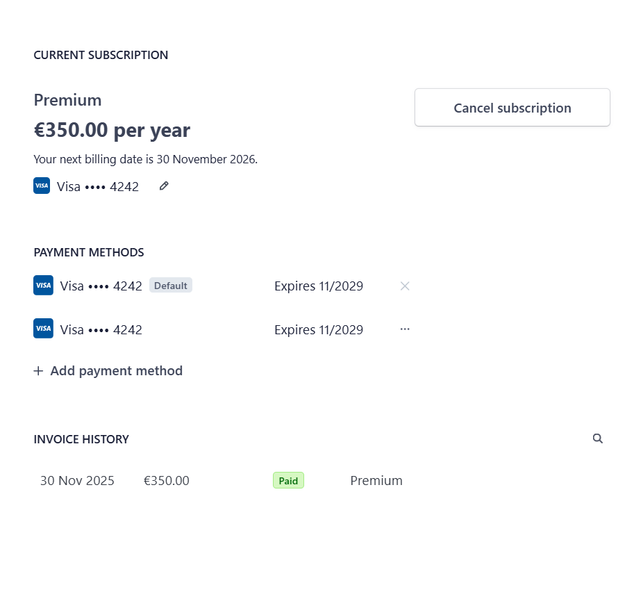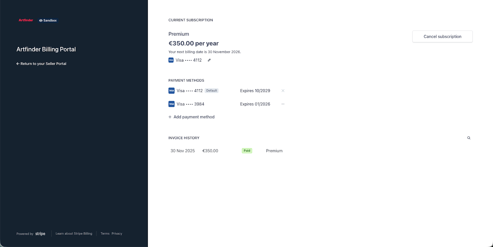 Please note that, effective from the 16th of December 2026, the Subscriptions page in your Seller Portal has been updated with a new layout and access method. This page now provides a single, secure location to manage your seller subscription, including viewing payment methods, downloading invoices, and cancelling your subscription via Stripe. Please note that this change is not linked to the upcoming Stripe Connect change in 2026. There is nothing you will be required to set up to be able to access this new change on your seller portal.